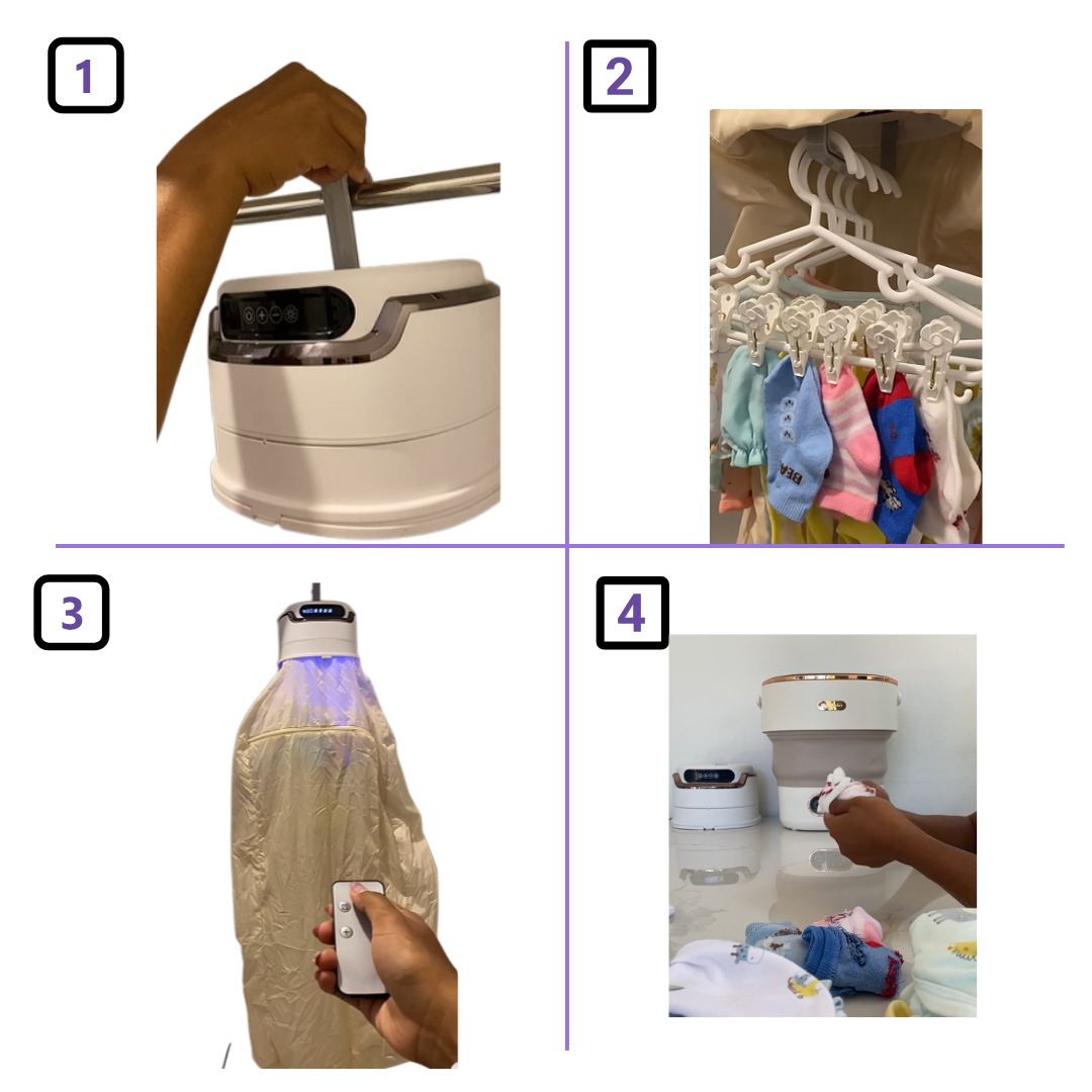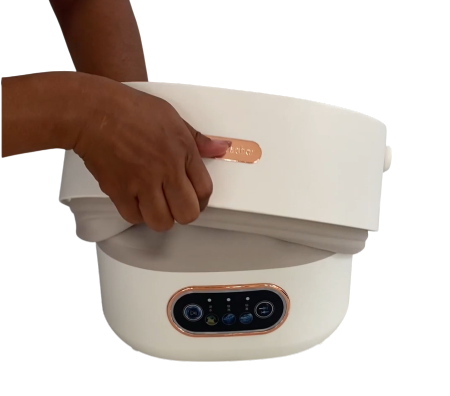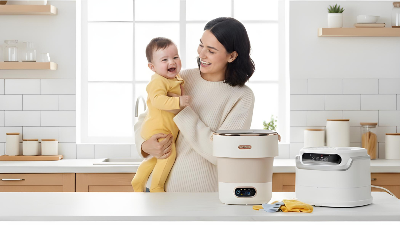 Run the portable dryer cycle to gently dry baby garments. Once complete, fold the washing machine flat for easy storage.
